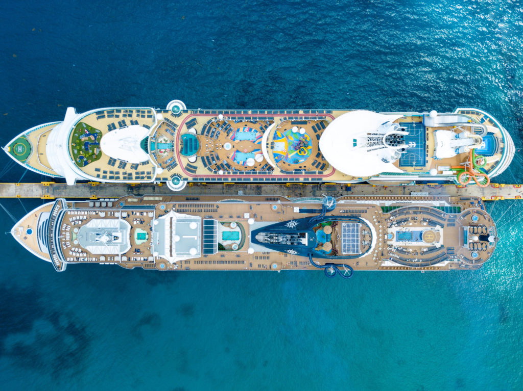 This photo was taken at the cruise port in Costa Maya, Mexico. The ship on the right is the Royal Caribbean Liberty of the Seas and the ship on the right is the MSC seaside.